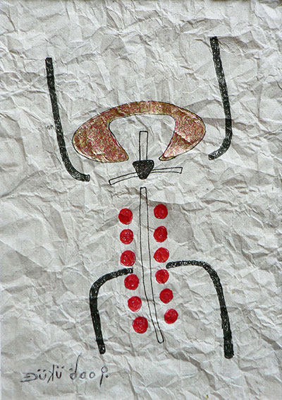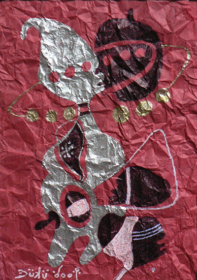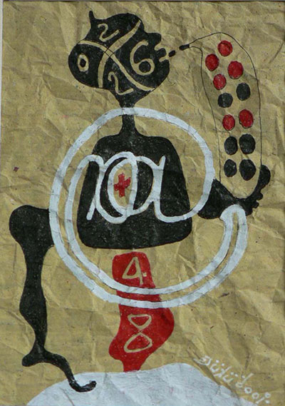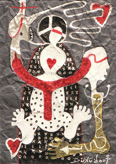 - Cette exposition aborde les questionnements autour de l’Awale, Pour la première fois je montrais l’exploration des « mots valises » qui jalonnent les titres des œuvres. En effet l’ensemble des titres des œuvres de cette exposition finissent par se lire comme une trame poëtique. Selon les mots de Mame Diarra DIOP , AMAATAWALE semble « énigmatique ou pas pour le connaisseur et le novice…il y a également le sourire en coin, cette lueur dans le regard du peintre ..on le questionne et on attend cette réponse « regardez donc les textes »…ses peintures ont des titres étranges et sont accompagnées d’une série d’explications sur papier, comme des clés, un jeu…Ouroboros, Diopattitude, l’œuf d’Ama autant de nom et d’association de mots qui laissent voir le côté universel.